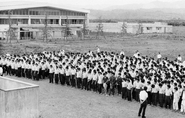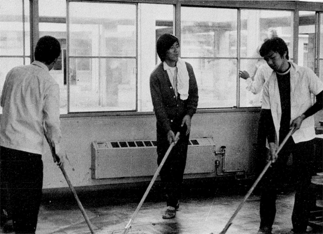 中庭の昼礼、後ろにも先生方が・・・教室の掃除当番、頑張る川崎君と小田君寝てるやつは誰だ!食事当番、先生のめしはガチガチに固めて入れちまえ!!まだメシの準備出来ないの!!と前川君・・・旨そうに食べる家木君!、その前に六本木君が・・・